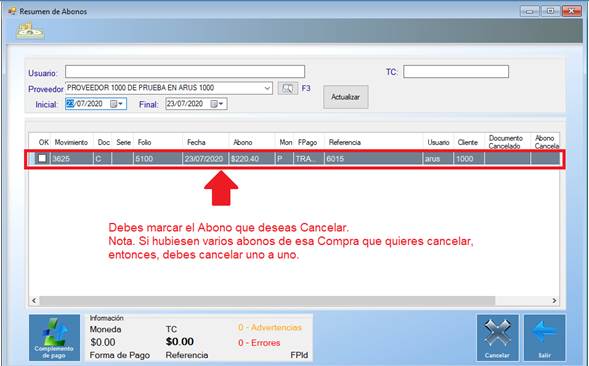 Paso 6. Enseguida puedes seleccionar uno a uno o todos los abonos que correspondan al documento para cancelar.