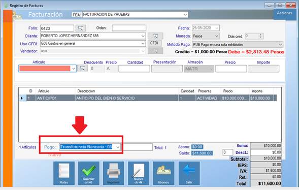 a). Debes capturar de forma manual el código del servicio a Facturar (Anticipo1.
